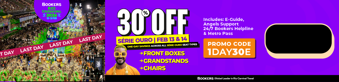 Guided transfer to the Sambadrome: Buy your tickets in sectors 2, 4, 6, 8, or 10 to enjoy the Courtesy Transfer to and from the Sambadrome, using the subway with our leading Bookers Angel guide. Daily departure from the Helpdesk in Copacabana departs at 7 PM all days on all parade days. T-shirt and metro pass on our own.
